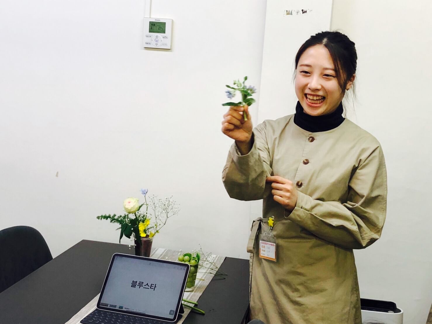 (生花と韓国語で自己表現するインターン生のひかりさんの写真)